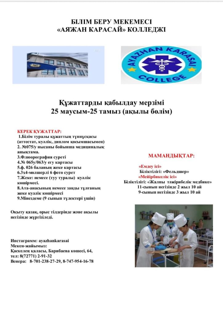 Құрметті мектеп бітіруші түлектер! Біз сізді "Аяжан Қарасай" медициналық колледжіне шақырамыз. Емдеу ісі саласы бойынша: Мамандығы: ...